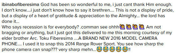Home In The News Ibinabo Fiberesima Pulls Stunt On Instragram (Photo) Ibinabo Fiberesima Pulls Stunt On Instragram (Photo) December 2, 2016 1053 0 Share Facebook Twitter Pinterest WhatsApp She shared the above photo and ofcus everyone thought she had just bought the new Range as she kept repeating this wasn’t about bragging but a grateful heart and she ended it this way RELATED ARTICLESMORE FROM AUTHOR In The News UNESCO, SUBEB begin sensitisation, school mapping in Bayelsa In The News Dangote Refinery to Supply 1.5bn Litres of Petrol Monthly In The News NRC Welcomes Court Judgment Jailing Two Vandals; Raises Alarm Over Fresh Attack on 33Kv Power Line in Rigasa LEAVE A REPLY Cancel replyLog in to leave a comment Follow us23,157FansLike